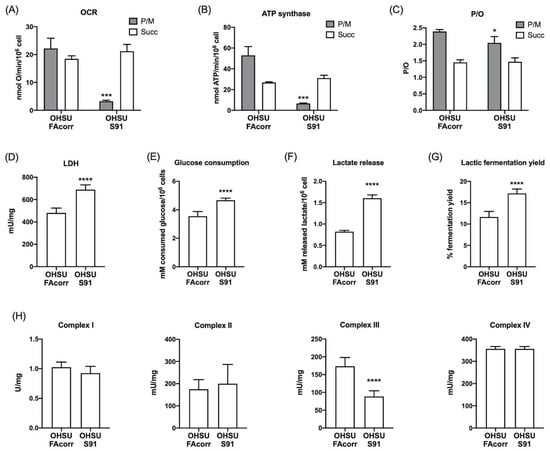 Aerobic metabolism and lactic fermentation in OHSU-974-FAcorr and OHSU-974-S91 cells. (A) Oxygen consumption rate (OCR). (B) Aerobic ATP synthesis through FoF1 ATP-synthase. For both graphs, data were obtained using pyruvate plus malate (grey columns) or succinate (white columns) as respiring substrates. (C) P/O value, an indicator of OxPhos efficiency, is calculated as the ratio between the synthesized ATP and the OCR. (D) Lactate dehydrogenase (LDH) activity. (E) Glucose consumption. (F) Lactate release in the growth medium. (G) Lactic fermentation yield. (H) Mitochondrial respiratory complexes activity. Data are reported as mean ± SD, and each graph is representative of at least 3 independent experiments. Statistical significance was tested opportunely with the unpaired t-test or two-way ANOVA. *, ***, and **** represent a p < 0.05, 0.001, and 0.0001, respectively, between OHSU-974-S91 cells and the OHSU-974-FAcorr cells, used as control.