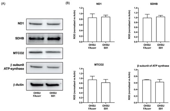 To understand if the dysfunctional aerobic metabolism depends on a defect in respiratory complexes’ function, their activities were measured spectrophotometrically in both cell lines (Figure 1H). No significant differences in complexes I, II, and IV activity were observed comparing the two cell lines. By contrast, the data show a statistically significant decrease in complex III activity in OHSU-S91 compared to OHSU-FAcorr when evaluated by NADH addition but not in the presence of succinate (Figure 1H and Figure S1). Since the respiratory complex III activity is measured by assaying the electron transport from upstream complexes, the impairment observed in the presence of NADH, but not of succinate, confirms that the weak point is the electron transfer between the first and third complexes and not complex III itself, as already observed in FA lymphoblasts [25]. Nevertheless, no differences are observed in the protein expression of ND1 (Complex I), SDHB (Complex II), MTCO2 (Complex IV), and ATP synthase β subunit between OHSU-S91 and OHSU-FAcorr, indicating that the altered metabolism is not related to a different expression of OxPhos proteins (Figure 2A,B).