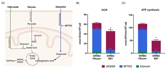 Respiratory substrates affinity in OHSU-974-FAcorr and OHSU-974-S91. (A) Graphical representation of the inhibitors targets used to evaluate the respiratory substrates’ affinity of OxPhos metabolism. BPTES is a glutaminase inhibitor; Etomoxir prevents the transport of fatty acids to the mitochondrion, inhibiting beta-oxidation; and UK5099 is Pyruvate Dehydrogenase (PDH) inhibitor. (B) The extent of OCR for glucose (inhibited by UK5099, Bordeaux), glutamine (inhibited by BPTES, Blue), and fatty acids (inhibited by Etomoxir, green). (C) The extent of ATP synthesis through FoF1 ATP-synthase for glucose (inhibited by UK5099, Bordeaux), glutamine (inhibited by BPTES, Blue), and fatty acids (inhibited by Etomoxir, green). Data are reported as mean ± SD, and each graph is representative of at least 3 independent experiments. Statistical significance was tested with two-way ANOVA. * and ** represent a p < 0.05 and 0.01, respectively, between OHSU-974-S91 cells and the OHSU-974-FAcorr cells used as control.