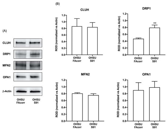 Expression evaluation of proteins involved in mitochondrial dynamics in OHSU-974-FAcorr and OHSU-974-S91 mitochondrial dynamics. (A) Western blot (WB) signals of CLUH (a regulator of mitochondria dynamic), DRP1 (a marker of mitochondrial fission), MFN2, OPA1 (two markers of mitochondrial fusion), and β-Actin. Each WB signal is representative of at least 3 independent experiments. (B) Densitometric analysis of the WB signals reported in Panel A, normalized versus β-Actin signal. Data are reported as mean ± SD, and each graph is representative of at least 3 independent experiments. Statistical significance was tested with an unpaired t-test. ** represents a p < 0.01 between OHSU-974-S91 cells and the OHSU-974-FAcorr cells used as control.