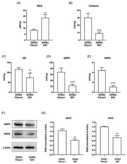 Since FA cells are characterized by elevated oxidative stress [24,42,43], to verify whether HNSCC cells carrying FANCA mutation display an oxidative damage increment, the malondialdehyde (MDA) level has been assayed in OHSU-FAcorr and OHSU-S91. Data in Figure 7A show that in OHSU-S91, there is a 2.5-fold increase in MDA accumulation compared to the OHSU-FAcorr. Conversely, texting the enzymatic antioxidant activities, results show a reduction of about 60% for catalase, G6PD, and H6PD activity (Figure 7B,D,E, respectively) and about 40% for GR (Figure 7C) in OHSU-S91 compared to OHSU-FAcorr. In addition, a Western blot analysis shows that the G6PD and H6PD activities reduction is associated with a decrement in their expression (Figure 7F,G).