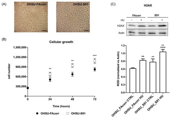Morphology and growth curve of OHSU-974-FAcorr and OHSU-974-S91 and the evaluation of DNA double-breaks in the absence or presence of hydroxyurea. (A) Example of OHSU-974 FAcorr and OHSU-S91 morphology observed at the transmitted-light microscope. The scale bar corresponds to 50 μm. Each panel is representative of at least five fields of three independent experiments. (B) The growth curves of OHSU-974 FAcorr and OHSU-S91 were monitored for 72 h, every 24 h. (C) WB signal of phosphorylated-γ-H2AX (H2AX), a marker of DNA damage accumulation, in the absence or presence of hydroxyurea (HU) (upper part), and the relative densitometric analysis normalized versus β-Actin (lower part). Data are reported as mean ± SD, and each graph is representative of at least 3 independent experiments. Statistical significance was tested with a two-way ANOVA test. ** and *** represent a p < 0.01 and 0.001, respectively, between OHSU-974-S91 cells and the OHSU-974-FAcorr cells used as control and °°, °°°° represent a p < 0.01 and p < 0.0001 between HU-treated and untreated cells.