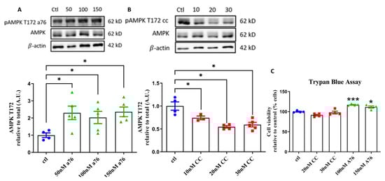 To assess the validity of CC and A76 in modulating AMPK phosphorylation status in RA differentiation of SH-SY5Y cells, multiple, previously reported doses of both compounds [,,,,,,,] were examined over 24 h before AMPK T172 phosphorylation status was assessed via WB (Figure 1A). CC inhibits AMPK activation by acting as an AMP mimetic, binding to the -subunit and preventing AMP from promoting T172 phosphorylation, whereas A76 allosterically binds to the -subunit to prevent the desphophorylation of T172 []. Cells were treated with either 50 M, 100 M, or 150 M A76 (Figure 1A) and 10 , 20 M, or 30 M CC (Figure 1B). For both CC and A76, all three doses chosen for each drug were effective at modulating AMPK phosphorylation status at 24 h (Figure 1), with no loss in cell viability (as determined via Trypan blue assay, 7 day treatment; Figure 1C); 30 M CC and 100 M A76 were used for subsequent experiments.