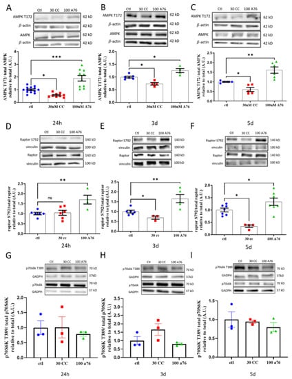 SH-SY5Y cells treated with 100 M A76 for 1, 3, or 5 days showed significant increases in AMPK T172 phosphorylation compared to control (Figure 2A–C). Treatment of the cells with 30 M CC for 1, 3, or 5 days resulted in significant reduction in AMPK T172 phosphorylation compared to control (Figure 2A–C). Given the role of AMPK in regulating protein/cell synthesis, we then examined the influence of AMPK phosphorylation on mTORC1 formation. AMPK phosphorylates raptor on S792, preventing mTORC1 complex formation [,,]. Treatment of cells with 100 M A76 for 1, 3, or 5 days resulted in higher raptor S792 phosphorylation compared to control (Figure 2D–F), whereas only treatment with 30 M CC for 3 and 5 days resulted in lower raptor S792 phosphorylation compared to control (Figure 2E,F). To confirm the effect of AMPK activation on the modulation of the mTORC1 activity, the downstream marker phosphorylation of p70s6k was examined. p70s6k is a well-described marker directly targeted by mTORC1, whose increase in phosphorylation is indicative of increased mTORC1 activity []. No change in p70s6k phosphorylation was observed at any timepoint with either treatment despite changes in raptor phosphorylation status (Figure 2G–I). Overall, our treatments with A76 and CC altered AMPK phosphorylation status as well as the phosphorylation status of a marker directly associated with mTORC1 activity (raptor).