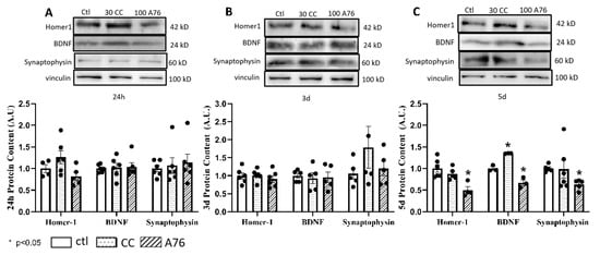 No changes in synaptophysin, Homer-1, or BDNF protein levels were observed following 24 h or 3 days of treatment of SH-SY5Y cells with CC or A76 (Figure 3A,B); however, a significant reduction in all neuronal marker levels was seen following 5 days of A76 treatment (Figure 3C), while BDNF content showed significant increases in content following 5 days of CC treatment (Figure 3C).
