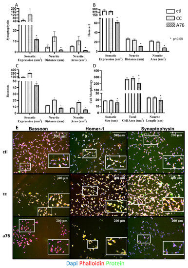 Treatment with 30 M CC had no significant effect on any marker of cell morphology; however, treatment of the cells with 100 M A76 for 5 days resulted in significant reductions in soma size, total cell area, and projection length relative to controls (Figure 4D). With A76, a reduction in total cell expression of synaptophysin, Homer-1, and Bassoon (Figure 4A–C) was observed alongside a significant reduction in the fluorescent expression of synaptophysin, Homer-1, and Bassoon for both distance projected as well as area of expression within a neurite (Figure 4A–C). Following CC treatment, Bassoon showed increases in total cell expression, distance of expression with neurites, and area of expression within neurites, indicating a greater expression and potential availability of Bassoon at the synapse with CC (Figure 4D).