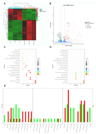 DEGs analysis and its functions annotation after lncFAM200B overexpression. (A) Clustering map of DEGs. (B) Volcanic map of DEGs. The up-regulation genes of the Notch signaling pathway members and down-regulation of cell cycle related genes are mapped. The top 20 enriched pathways of up-regulated and down-regulated DEGs are presented in (C,D), respectively. (E) GO enrichment analysis of DEGs. The GO terms of up-regulated and down-regulated DEGs was differentiated by red and green color, respectively.