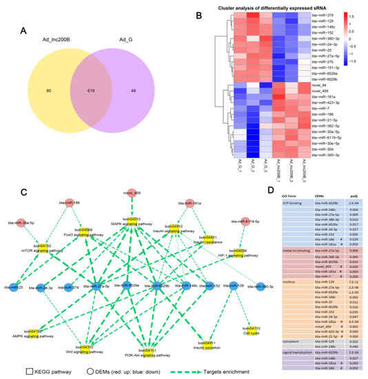 To analyze the miRNA profiles during lncFAM200B effects on preadipocyte differentiation, the small RNA sequencing was performed. The results showed that most reads were approximately 22–23 nt, and 23 nt length was most frequent (Supplementary Figure S1). An average of 483 and 492 sRNA sequences in the Ad_ G and Ad_lnc200B groups, respectively, were mapped to mature miRNAs in the miRBase (www.mirbase.org, accessed on 26 June 2022) database, and 78 and 85 novel miRNAs were predicted in the two groups, respectively (Supplementary Table S1). A total of 610 miRNAs and 138 novel miRNAs were identified, and 619 common miRNAs were screened (Figure 2A); 25 differentially expressed miRNAs were identified, which included 13 up-regulated and 12 down-regulated miRNAs (Figure 2B, Supplementary Table S3).
