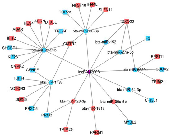 The ceRNAs network of lncFAM200B during the yak preadipocyte differentiation. The red color indicates up-regulated DEMs and DEGs, and the blue color indicates the down-regulated DEMs and DEGs after lncFAM200B overexpression.
