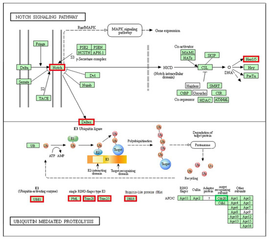 The DEGs in Notch signal pathway and ubiquitin-mediated proteolysis pathway. The red box indicates the up-regulated genes in the pathway after lncFAM200B overexpression, and the green indicates down-regulation.