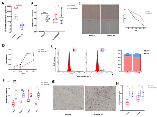 Effects of up-regulation of miR-6529a expression on proliferation and differentiation of preadipocytes. (A) Overexpression of miR-6529a. (B) The mRNA expression levels of TRIM21 and lncFAM200B after miR-6529a overexpression. (C) Scratch test. Only 0 h (top) and 36 h (bottom) results are posted here. The Scratch ratio was obtained by dividing the current scratch width by the initial width. (D) CCK-8 results. (E) Flow cytometry after miR-6529a overexpression. (F,H) are the expression of proliferation marker and differentiation marker after overexpression of miR-6529a, respectively. (G) Oil red O staining results. Results are presented as mean ± SD, * p < 0.05. ** p < 0.01. *** p < 0.001.