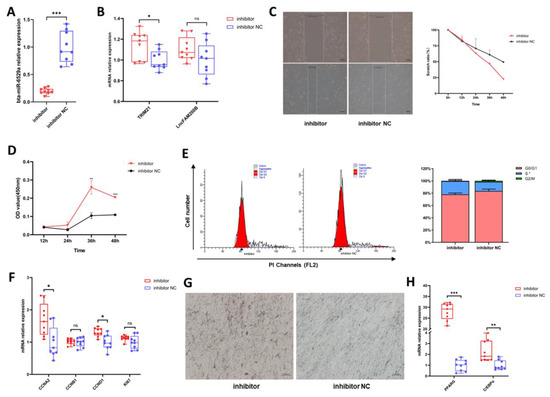 Effects of suppression of miR-6529a expression on the proliferation and differentiation of preadipocytes. (A) Inhibition of miR-6529a. (B) The mRNA expression levels of TRIM21 and lncFAM200B after miR-6529a inhibition. (C) Scratch test. The top figures are results at 0h and the bottom figures are results at 36h. (D) CCK-8 results. (E) Flow cytometry after miR-6529a inhibition. (F,H) are the expression of proliferation marker and differentiation marker after inhibition of miR-6529a, respectively. (G) Oil red O staining results. Results are presented as mean ± SD, * p < 0.05. ** p < 0.01. *** p < 0.001.