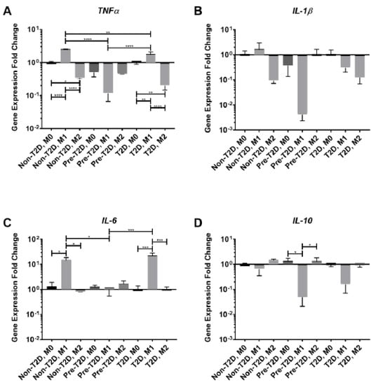 3.4. Reduced Expression of TNFα and IL-6 in M1 Macrophages Co-Cultured with Pre-T2D IPFP-ASCs