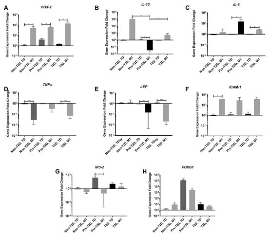 3.5. Decreased Expression of Leptin and IL-10 and Increased Expression of COX-2 and FOXG1 in Pre-T2D IPFP-ASCs Co-Cultured with M1 Macrophages