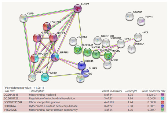 Mitochondrial BioID network filtered for interactions with CLPB as prey, shown as STRING diagram. Schematic visualization of each protein–protein interaction (PPI) component as bullet, the enriched pathways reflected by bullet coloring as detailed in the lines below. (The text columns represent pathway code, pathway description, network count, enrichment strength, false discovery rate statistics on enrichment significance, and color code. The single test of PPI enrichment is given as the p-value, while the multiple testing of pathway enrichments below is evaluated by false discovery rate q-values.) The association evidence strength is highlighted as colored lines. CLPB and LONP1 as mitochondrial matrix AAA+ unfoldases are shown in the upper left. Interaction between CLPB and MTIF2 is well documented in other STRING organisms (anti-tag coimmunoprecipitation in human and bacteria (see [43,44,45,46,47]), coexpression and genomic neighbors in other organism). FASTKD2, GRSF1, DHX30, and RPUSD4 are already classified as components of ribonucleoproteins; recent experiments showed also LRPPRC to associate with mitochondrial RNA granule factors [48]. LRPPRC, RPUSD4, and RMND1 are modulators of mitoribosomal translation. The respiratory chain components COX15, SURF1, and ACAD9 may reflect the fact that translation efficiency and fidelity are needed particularly for the cytochrome-c oxidase complex IV, as the rate-limiting step of oxidative phosphorylation. Apart from the enrichment of the RNA processing pathway, mitochondrial membrane carriers including the NAD+ carrier SLC25A51, the S-adenosylmethionine carrier SLC25A46, calcium-associated carriers SLC25A12 and MTCH2, and putative calcium uniporters CCDC90B/CCDC109B were also observed in unexpected numbers. This may reflect a submitochondrial position of CLPB near the inner membrane.