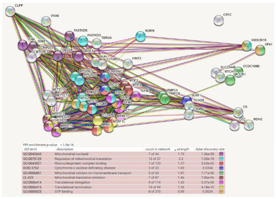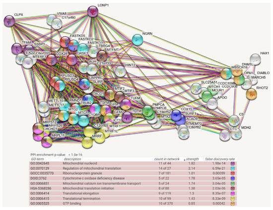For CLPX as prey also, the STRING meta-analysis generated a highly significant (q < 1.0 × 10−16) enrichment for protein–protein interactions, and almost all 73 baits are normally localized to mitochondria. Prominent pathways and Gene Ontology (GO) terms showed clusters of interactions ranging from the nucleoid via mitochondrial RNA granules to mitoribosomal translation (now including the initiation, elongation, and termination steps) and extending to fusion/fission machinery and matrix enzymes. Interestingly, the association of proteins with GTP was enriched (Figure 2). CLPX was not employed as bait in the mitochondrial BioID survey [21].