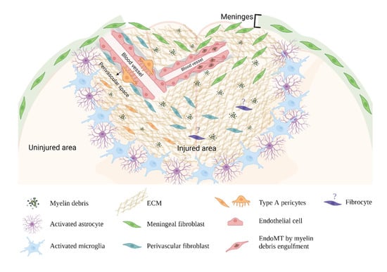 Therefore, some fibroblasts/fibroblast-like cells can elicit the immune responses by sensing the injury, releasing cytokines to recruit innate immune cells, activating the adaptive immune system, and increasing adhesion for immune cell infiltration and activation. According to the characteristics that are discussed above, fibroblasts/fibroblast-like cells that are derived from meningeal cells, endothelial cells, pericytes, and perivascular cells can potentially play a role in neuroinflammation in CNS injuries. An example is the engulfment of myelin debris by endothelial cells (sensing the injury), where endothelial cells transition toward a fibroblast-like phenotype and overexpress important inflammatory molecules such as CCL2, IL-6, and VCAM-1 (immune response) [] (Figure 2).