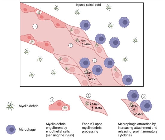 Role of endothelial cells in neuroinflammation in SCI lesions. Upon SCI, ongoing demyelination of axons causes the persistent presence of myelin debris in the injury area. Endothelial cells sense the injury and engulf the myelin debris, resulting in EndoMT. These endothelial cells secrete inflammatory factors that induce macrophage infiltration and attachment, promoting neuroinflammation. This image was created with BioRender.com (accessed on 29 July 2022).