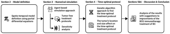 The remainder of the paper is organized as follows: In Section 2, we introduce our spatio-temporal mathematical model of BCG-based treatment of BC. In Section 3, we present a numerical simulation of the proposed model for several clinical stages and a numerical sensitivity analysis for several parameters by using an agent-based simulation approach. In Section 4, we offer a method for finding the time-optimal treatment protocol given the patient’s initial condition by using a genetic algorithm. In Section 5 and Section 6, we discuss the main clinical results arising from the model and propose final remarks with possible future work. A schematic view of this structure is presented in Figure 1.