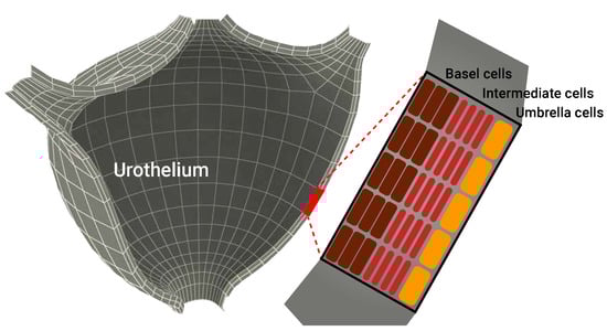 A schematic view of the geometrical configuration of the urothelium used in the model. The three-dimensional mesh configuration was adopted from []. In addition, the urothelium’s geometry is populated by eight layers of cells with a depth of 40 cells, following the model proposed by [].