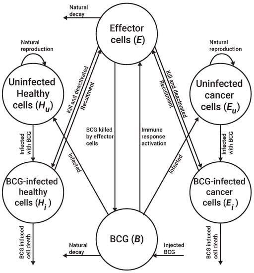 In Equation (5), is the dynamical rate of the BCG-infected healthy cell population’s distribution over time and space. It is affected by the following two terms. First, uninfected healthy cells become BCG-infected healthy cells after an interaction with BCG at an average rate of . Second, effector cells eliminate BCG-infected cancer cells at an average rate of .