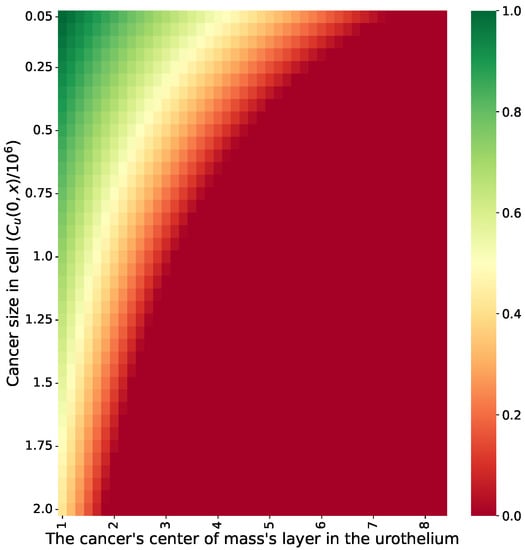 Based on this model, we evaluated the effectiveness of the classical treatment protocol [], which is considered the gold standard to date [], to obtain a tumor-free equilibrium for different spatial configurations of the size and distribution of cancer cells, as shown in Figure 5. Unsurprisingly, with greater shallowness and fewer cancer cells, the the treatment protocol worked better. In particular, based on Equation (8), the initial number of cancer cells is responsible for 26% of the treatment success rate, while the average layer in the urothelium is responsible for 35%, and the combination between the two is responsible for 39%, as one can find by normalizing the coefficients of the parameters (not including the free coefficient). Hence, according to the proposed model, the classical treatment protocol, which does not have any specifications for the cancer cells’ spatial distribution, is effective for either a large mass of cancer cells located on a very shallow layer of the urothelium or a much deeper layer when the number of cancer cells is relatively small. These results agree with those of previous models [,]. Nonetheless, due to the lack of clinical evaluations of these or previous models, it is challenging to conclude on the exact accuracy of these predictions.