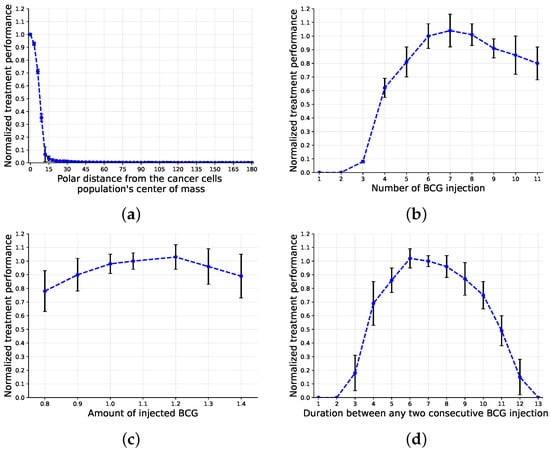 In addition, the sensitivity of the model to changes in the treatment parameters with respect to the default treatment protocol was explored, as shown in Figure 5, where the X-axis provides the parameter values and the Y-axis represents the normalized treatment performance. Namely, the normalized treatment performance is the number of successful treatments obtained by applying the modified treatment protocol divided by the number of successful treatments obtained with the classical treatment protocol for a given initial condition. Specifically, the polar distance from the cancer cell population’s center of mass monotonically decreases, as shown in Figure 5a. On the other hand, the number of BCG injections, number of injected BCG cells, and duration between any two consecutive BCG injections increase up to some point (7, 1.2, and 6) and then decrease, as presented in Figure 5b–d, respectively.