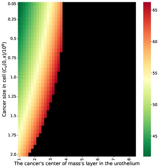 Using the proposed GA, we computed the time-optimal treatment protocol for multiple patients’ initial conditions with different cancer cell population distributions and sizes. Since the treatment was assumed to be provided on a daily basis, we constrained the duration between two BCG injections to be a fixed number of days. The results of this analysis are shown in Figure 6, where the X-axis is the layer of the urothelium in which the uninfected cell population’s center of mass is located and the Y-axis is the size of this population; the value represents the predicted duration of the time-optimal treatment protocol. A black cell in the heatmap indicates that the algorithm was not able to find a successful treatment protocol after 100,000 iterations in a test of n = 1000 random samples.