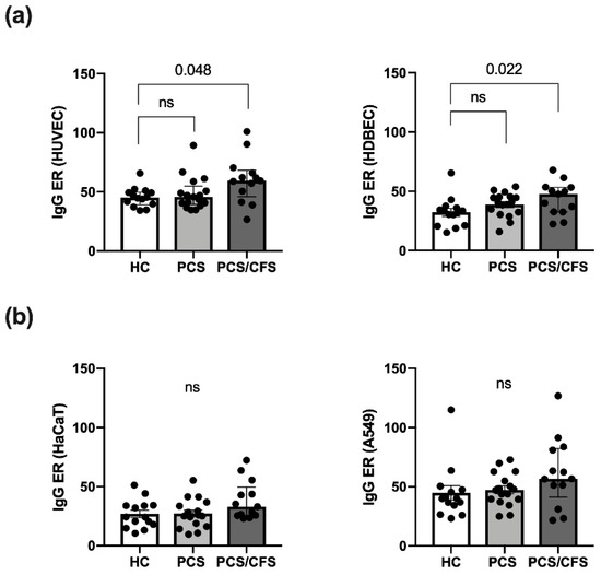 Quantitative analysis of autoantibody binding to cultured human endothelial and non-endothelial cells as determined by cell-based ELISA. Binding of autoantibodies to distinct cultured human cells was evaluated by a cell-based ELISA. Briefly, cells were incubated with 0.5% (v/v) patient (PCS, PCS/CFS) or control (HC) serum and an anti-human IgG HRP-labelled secondary antibody was used for detection of bound IgG. Shown are the IgG autoantibody levels as ELISA ratios (ER) normalised to included positive and negative controls for (a) two endothelial cell types i.e., macrovascular HUVEC (left) and microvascular HDBEC (right) and (b) two non-endothelial control cell lines, i.e., keratinocyte cell line HaCaT (left) and lung epithelial cancer cell line A549 (right). Median, interquartile range and single ER values are plotted. Statistical testing was performed using a Kruska-Wallis test. HC, healthy controls (n = 14). PCS, post-COVID-19 syndrome (n = 17). PCS/CFS, post-COVID-19 syndrome with ME/CFS (n = 13). ns, not significant (p value > 0.05).