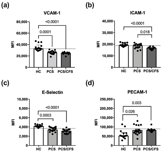 Endothelial cell activation surface marker expression following serum incubation. Expression levels of selected surface markers on HUVECs assessed by flow cytometry. Briefly, cultured cells were treated with 2% (v/v) patient (PCS, PCS/CFS) or control (HC) serum for 6 h before harvest and staining for flow cytometry. Examined are surface markers indicative for endothelial cell activation VCAM-1 (a), ICAM-1 (b), E-Selectin (c) and PECAM-1 (d). The expression levels are shown as mean fluorescence intensities (MFI). Dotted lines denote baseline marker expression level of untreated HUVECs. Statistical significance was determined using a Kruska-Wallis test. A p value ≤ 0.05 was considered significant. HC, healthy controls (n = 14). PCS, post-COVID-19 syndrome (n = 17). PCS/CFS, post-COVID-19 syndrome with ME/CFS (n = 13).