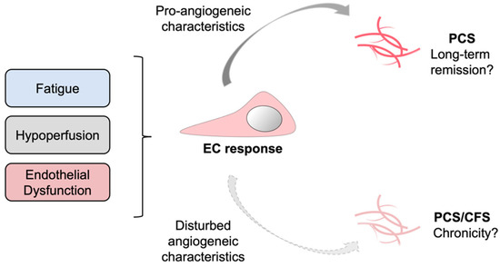 In our study the angiogenic potential of PCS/CFS patient sera resembled that of HCs, whereas the latter group did not suffer from ED. Contrarily, PCS patients with ED displayed a pro-angiogenic response suggesting a compensatory mechanism to ED which was absent in the PCS/CFS group. Going further, one could speculate on a contribution of lacking compensatory mechanisms to disease chronicity (Figure 5). Despite the limited number of patients in this study, the results and corresponding novel hypothesis described here could pave the way for further investigations and validation in larger cohorts. ME/CFS is known to be a long-lasting and chronic disease with a median duration of 10 years [82]. For PCS, as a recently emerged condition specific to COVID-19, there is currently no information on the disease’s time-course. However, the ongoing clinical observation of the present PCS and PCS/CFS cohorts at the Charité Fatigue Center can hopefully provide details on the disease course in the near future.