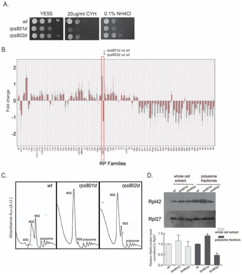 Rps8/eS8 paralog deletions exhibit different phenotypes upon various cellular process. (A) rps8 paralog deletions display paralog−specific phenotypes on the translation inhibitor drug (cycloheximide) and amino acid starvation (YE supplied with excess NH4Cl). (B) Quantification of ribosome proteins in rps8 paralog deletions, as well as wild types, by mass spectrometry. The details are described in Section 2. The fold change of Rpl42/eL42 (Rpl36A) exhibits an outstanding pattern. (C,D) Polysome analysis by sucrose gradient−based centrifugation among the wild−type, rps801d, and rps802d and quantification of the Rpl42/eL42 protein by Western blotting. Log−phase yeast grown on a rich medium supplemented with 100 uM cycloheximide prior to harvest in order to stabilize translating the ribosomes. The same amount of total cell extract was applied to sucrose gradient centrifugation. To localize the ribosomal subunits (40S and 60S) and intact ribosomes (80S and polysomes), fractionation was monitored at 254 nm. One−tenth of the total cell extract, as well as the protein extract from the polysome fractions, was immunoblotted. p−values were obtained by two−tailed Fisher’s exact test. * p < 0.05.