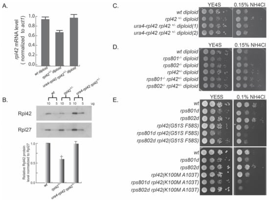 In order to test the genetic interaction between rps8 paralog deletions and rpl42, we deleted one copy of the rpl42 gene in rps801−/− homozygous diploid and rps802−/− homozygous diploid. Consistent with the rps8 paralog deletion haploid cells, the rps801−/− diploid cells showed sensitivity to excess NH4Cl, and rps802−/− diploid cells showed resistance to excess NH4Cl (Figure 2D). A single deletion of the rpl42 gene (rpl42+/−) reversed the growth of rps801−/− diploid cells in YE supplied with excess NH4Cl. Ribosomal proteins, such as Rpl36A (homolog of Rpl42/eL42), cannot be overproduced in budding yeast, because the excess proteins are rapidly degraded [28]. Consistently, while an extra copy of rpl42(ura4::rpl42) in wild-type fission yeast haploid cells did cause increased rpl42 transcription (Figure S4B), nonetheless, no increase was detected in the levels of the total Rpl42/eL42 protein or ribosome-integrated Rpl42/eL42 by Western blotting (Figure S4C). This precluded the test on whether increased Rpl42/eL42 incorporation in ribosomes could mimic the phenotypes of rps801d.