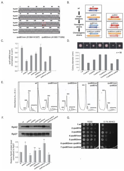 Firstly, the Rps8/eS8 mRNA level of the above strains was measured by qRT-PCR (Figure 3C). The results showed that the Rps8/eS8 mRNA level was decreased in rps801d and rps802mm rps801d to about 40% of the wild type and, in rps802d and rps801mm rps802d, to about 60% of the wild type, respectively. It suggests that the deletion strains, as well as the chimeric strains, have a similar mRNA level to Rps8/eS8. In addition, the Rps8/eS8 mRNA level in the homogenic strains was comparable or slightly decreased (rps801mm in Figure 3C) compared to the wild-type strain.
