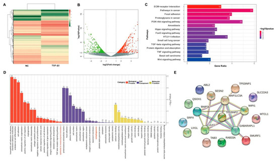 TGF-β2 is involved in autophagy and the EMT process in HLE cells. (A,B) Heatmap (A) and volcano plots (B) depict the differentially expressed genes in TGF-β2-treated or -untreated HLE cells. The red points, green points, and grey points represent upregulated genes, downregulated genes, and not differentially expressed genes, respectively. (C) The enrichment of KEGG pathways in TGF-β2-treated HLE cells vs. untreated cells. (D) Gene ontology (GO) analysis of DEGs; the top sixteen GO terms within three main subcategories (BP, CC, and MF) are shown. The significant DEGs of TGF-treated HLE cells are enriched in both autophagy and the EMT. The number on top of the bars represents the number of DEGs annotated to the GO terms. (E) Protein–protein interaction (PPI) analysis of upregulated DEGs annotated to GO terms correlated with autophagy.