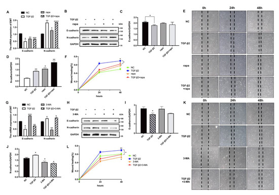 Given the dual regulatory role of autophagy on EMT in other types of cells, we examined the functional connection between autophagy and the EMT process in HLE cells. Two pharmacological agents, rapamycin (rapa) and 3-methyladenine (3-MA), were used. We co-treated the HLE cells with TGF-β2 and rapa, an activator of autophagy, which primarily blocked the MTORC1 signal pathway. As shown in Figure 4A–D, rapa effectively downregulated E-cadherin (epithelial marker) mRNA and protein levels and upregulated N-cadherin (mesenchymal marker) in HLE cells. Intriguingly, TGF-β2-treated cells and TGF-β2 + rapa co-treated cells were migrated faster than the NC group in a wound healing assay (Figure 4E,F). These results suggest that increased autophagy induced the EMT process in HLE cells. Coincidently, when autophagy inhibitor 3-MA was added to HLE cells, the opposite phenomenon was observed (Figure 4G–J): the suppression of autophagy inhibits TGF-β2-induced EMT and lowers the rate of cell migration (Figure 4K,L). Thus, the above results indicate that autophagy had a regulated effect on the EMT process.