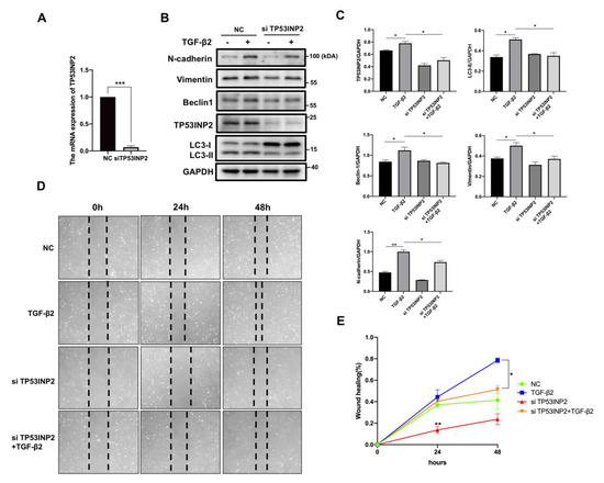TP53INP2 knockdown blocked the TGF-induced autophagy and the EMT in HLE cells. (A) The silencing efficiency of TP53INP2 in mRNA levels. Mean ± SD, n = 3, *** p < 0.001. (B) Immunoblotting of N-cadherin, vimentin, Beclin1, LC3, and TP53INP2 in siTP53INP2-transfected HLE cells with or without TGF-β2 (10 ng/mL) stimulation. (C) Quantitative Western blot analysis (normalized to GAPDH). Mean ± SD, n = 3. * p < 0.05, ** p < 0.01. (D) Wound healing analysis. The micrographs were taken after scratching for 0, 24, and 48 h. (E) Quantitative wound healing area relative to 0 h. Mean ± SD, n = 3. * p < 0.05, ** p < 0.01.