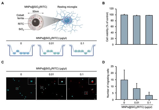 Reduction in migratory activity of MNPs@SiO2(RITC)-treated BV2 cells. (A) Schematic representation of the invasion assay performed with MNPs@SiO2(RITC)-treated BV2 cells. Non-treated control BV2 cells, 0.01 µg/µL MNPs@SiO2(RITC)-treated BV2 cells, and 0.1 µg/µL MNPs@SiO2(RITC)-treated BV2 cells were used. (B) Viability of MNPs@SiO2(RITC)-treated BV2 cells for 12 h. (C) Invasion assay of MNPs@SiO2(RITC)-treated BV2 cells. The nuclei of the cells were stained using Hoechst 33342, and the fluorescence was expressed as cyan. Fluorescence of MNPs@SiO2(RITC) distribution was expressed as red. The number of nuclei was counted in five randomly selected fields. Scale bar = 50 μm. Scale bar of cropped image = 5 μm. (D) Number of migrating cells. Data represent means ± standard deviation derived from three independent experiments. * p < 0.05 vs. control.