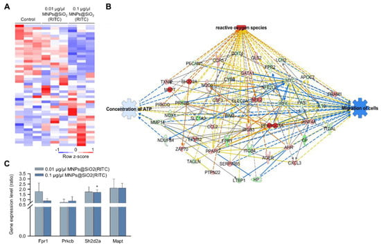 Transcriptomic analysis in MNPs@SiO2(RITC)-treated BV2 cells. (A) Heatmap of 48 genes related to cellular movement in the transcriptome of MNPs@SiO2(RITC)-treated BV2 cells observed with RNA-seq analysis. (B) Functional analysis of the transcriptomic network with prediction using IPA in 0.1 μg/μL MNPs@SiO2(RITC)-treated BV2 cells. The analysis involved a fold change cut-off value of ±1.5. Red and green nodes indicate genes whose expressions were upregulated and downregulated, respectively, compared to those of the control. Orange and blue arrows indicate the prediction of activation and inhibition, respectively. Details of shape and colour, which are originated from IPA. (C) qPCR analysis was performed to validate gene expression in each group. Gapdh was used as an internal control. Data represent means ± standard deviations of three independent experiments. * p < 0.05 vs. control.