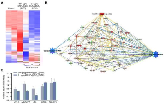 Proteomic analysis of MNPs@SiO2(RITC)-treated BV2 cells. (A) Heatmap of 60 proteins related to the cellular movement in the proteome of MNPs@SiO2(RITC)-treated BV2 cells from LC–MS/MS analysis. (B) Functional analysis of the proteomic network in 0.1 μg/μL MNPs@SiO2(RITC)-treated BV2 cells with prediction using IPA. The analysis involved a fold change cut-off value of ±1.5. Red and green nodes indicate genes whose expressions were upregulated and downregulated, respectively, compared to those of the control. Orange and blue arrows indicate the prediction of activation and inhibition, respectively. Details of shape and colour, which are originated from IPA. (C) Relative abundance levels of Myh9, Mboat7, Lpl, Pou2f1, and Cd80 according to LC–MS/MS analysis. Data represent the means ± standard deviation of the two TMT ratios. * p < 0.05 vs. control.