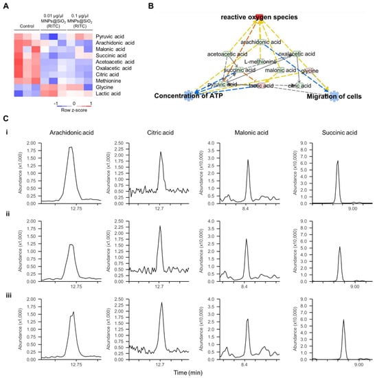 Metabolic profiling of MNPs@SiO2(RITC)-treated BV2 cells. (A) Heatmap of nine metabolites related to the cellular movement in the metabolome of MNPs@SiO2(RITC)-treated BV2 cells as observed with GC–MS/MS analyses. (B) Functional analysis of the metabolomic network in 0.1 μg/μL MNPs@SiO2(RITC)-treated BV2 cells with prediction using IPA. The analysis involved a fold change cut-off value of ±1.2. Red and green nodes indicate genes whose expressions were upregulated and downregulated, respectively, compared to those of the control. Orange and blue arrows indicate the prediction of activation and inhibition, respectively. Details of the shape and colour, which are originated from IPA. (C) Representative selected-ion monitoring chromatograms of arachidonic acid, citric acid, malonic acid, and succinic acid for (i) control, (ii) 0.01, and (iii) 0.1 µg/µL MNPs@SiO2(RITC)-treated BV2 cells.