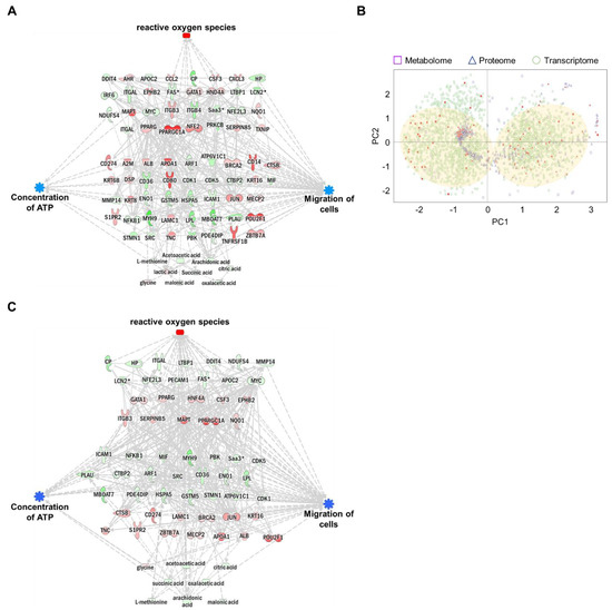 Each omics network was combined into a single triple-omics network to compensate for the potential weaknesses of each omics approach. In silico predictions for ROS, ATP concentration, and cell migration were consistent with single-omics network predictions. To reduce the complexity of multi-omics networks, we eliminated the controversial relationship between molecules and biological function. The network consisted of 31 genes, 45 proteins, and nine metabolites (Figure 5A and Figures S9–S12). The trimmed network showed strong relationships among genes, proteins, metabolites, and biological functions.