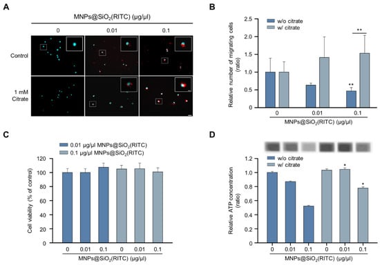 Recovered migratory activity of MNPs@SiO2(RITC)-treated BV2 cells by citrate treatment. (A) Transwell assay of MNPs@SiO2(RITC) and citrate co-treated BV2 cells. The nuclei of the cells were stained using Hoechst 33342, and the fluorescence was expressed as cyan. Fluorescence of MNPs@SiO2(RITC) distribution was expressed as red. The cells were counted under a fluorescence microscope in five randomly selected fields. The number of nuclei was counted in five randomly selected fields. Scale bar = 50 μm. Scale bar of cropped image = 10 μm. (B) The number of migrated cells. Data represent means ± standard deviation of three independent experiments. * p < 0.05 vs. control. ** p < 0.01 vs. control. (C) Viability of MNPs@SiO2(RITC)-treated BV2 cells in the presence of 1 mM citrate for 12 h. (D) Intracellular ATP levels in MNPs@SiO2(RITC)-treated BV2 in the presence of 1 mM citrate for 12 h. Data represent means ± standard deviation of three independent experiments. * p < 0.05 vs. control.