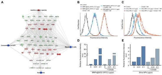 Induction of exocytosis in MNPs@SiO2(RITC)- and silica NP-treated BV2 cells by citrate treatment. (A) Trimmed using machine learning algorithm triple-omics network with the prediction of 0.1 µg/µL MNPs@SiO2(RITC)-treated BV2 cells including exocytosis. Top group: transcriptome, middle group: proteome, bottom group: metabolome. Symbols are described in the legend of Figure S2. Orange and blue areas indicate the prediction as activation and inhibition, respectively. FACS analysis for evaluation of fluorescence of (B) MNPs@SiO2(RITC) and (C) silica NP-treated BV2 cells in the presence of 1 mM citrate. Relative fluorescence intensity of (D) MNPs@SiO2(RITC) and (E) silica NPs in BV2 cells. a.u.: arbitrary unit.