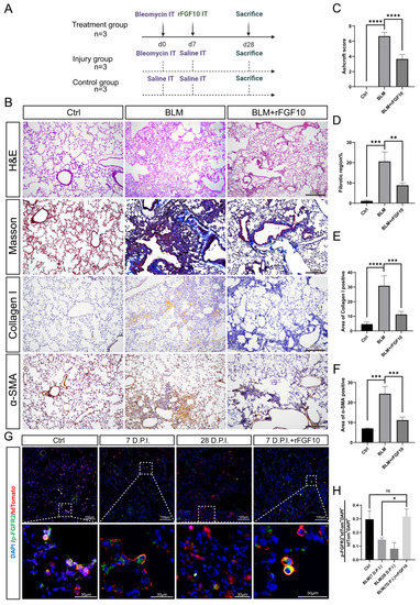 The following supporting information can be downloaded at: https://www.mdpi.com/article/10.3390/cells11152396/s1, Figure S1: FGF10 is overexpressed in bleomycin injury group; Figure S2: rFGF10 reduces hydroxyproline content; Figure S3: rFGF10 have no effect on normal lung tissue; Figure S4: rFGF10 exhibits preventive efficacy toward BLM-induced injury; Figure S5: rFGF10 exhibits therapeutic efficacy toward BLM-induced fibrosis.
