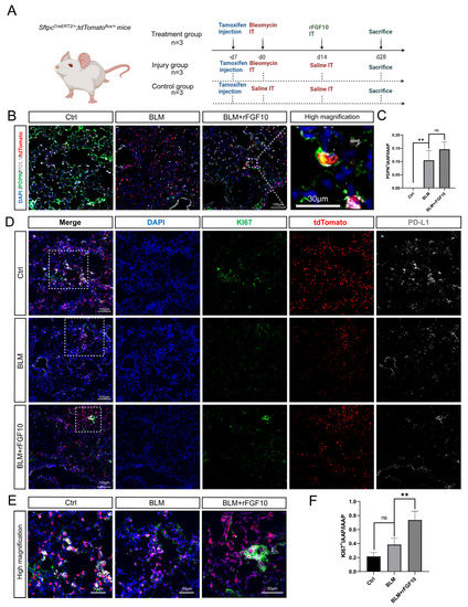 Using the SftpcCreERT2; tdTomato lineage-traced mice, we recently reported a novel AT2-IAAP subpopulation characterized by low Sftpc expression but that is enriched for PD-L1 expression [22]. IAAP cells, which represent quiescent and immature epithelial progenitors, undergo activation and expansion following PNX injury [22]. We recently reported the deletion of Fgfr2b in SftpcPos cells and demonstrated that FGFR2b signaling is necessary for the survival of mature AT2s (tdTomHigh). Interestingly, IAAPs were concomitantly activated and proliferated [28]. Furthermore, IAAPs displayed upregulated Fgfr2b and Etv5 expression, suggesting that these cells not only escaped Fgfr2b deletion by a mechanism that remains to be identified but responded to FGFR2b signaling. To explore whether IAAPs can also be activated by rFGF10 to play a progenitor role after BLM injury, SftpcCreERT2/+; tdTomatoflox/+ mice were used to label the AT2 lineage, rFGF10 was administered at 14 dpi, and all mice were sacrificed at 28 dpi (Figure 2A). Co-staining for the canonical AT1 marker PDPN and PD-L1 showed that labeled AT2s distributed sporadically throughout the alveolar region in the control group, as shown in Figure 2B. BLM administration caused gross damage to both AT1 (PDPN) and AT2 (SFTPC) cells relative to the control group. However, rFGF10 administration showed a reparative re-organization effect on both cell types and alveolar structures. Furthermore, we identified tdTomatoPos cells that co-stained for PDL1 and PDPN in BLM + rFGF10 mice, suggestive of a PD-L1-positive precursor to these cells, presumably IAAPs (Figure 2B). Figure 2C shows the ratio of PDPN+IAAPs in total IAAPs in the BLM group, which remained statistically higher, although in the BLM + rFGF10 group compared to the BLM group, no statistical significance was observed. In addition, co-staining of lung sections for tdTomato, PD-L1, and the proliferation marker Ki67 revealed an increased number of ki67-enriched clusters of PD-L1Pos tdTomatoPos cells in BLM + rFGF10 mice when compared to BLM-alone and control mice, suggesting that the clustering may have been a result of a proliferative response. In contrast, under the action of rFGF10, cells co-expressing SFTPC, PD-L1 and Ki67 were statistically enriched in areas of alveolar damage (Figure 2D–F). Altogether, these results suggest that in the context of BLM injury, rFGF10 may promote the proliferation of IAAPs, which will later differentiate into AT1s.