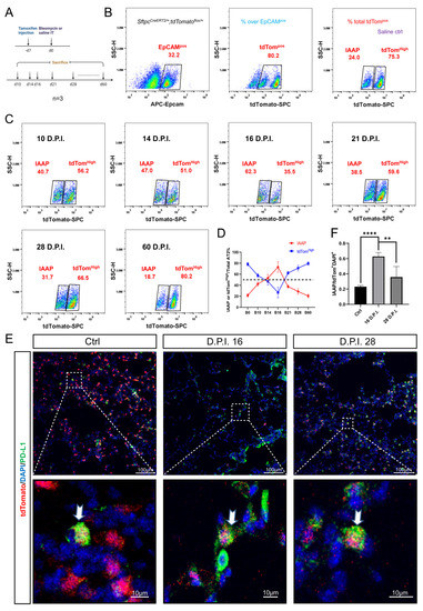 Next, we sought to determine whether the mature AT2s and IAAPs are differentially involved in BLM-induced injury using the SftpcCreERT2/+; tdTomatoflox/+ mice to label the AT2 lineage (Figure 3A). The lungs of euthanized mice were processed for single-cell suspensions at 14, 21, and 28 dpi. After removing CD31Pos and CD45Pos cells by MACS to enrich for the epithelial population, the cells were stained with APC-EpCAM antibodies and subjected to FACS analysis. We showed that the proportion of EpCAMPos cells as a percentage of total cells was 32.2%, of which the percentage of tdTomPos cells was 80.2% in the control mice. IAAPs and mature AT2s represented 24.0% and 75.3%, respectively, of the overall tdTomPos cells in the control mice (Figure 3B). Interestingly, the relative ratio of IAAPs to tdTomPos AT2s was increased to 47.0% in the 14 dpi group, and this ratio decreased to 38.5% at 21 dpi, then 31.7% at 28 dpi, which is still higher than that of the control group. In contrast, the tdTomHigh AT2 population decreased to 51.0% at 14 dpi, rebounded to 59.6% at 21 dpi, and continued to rise at 28 dpi (66.5%) (Figure 3C). Our data suggest that, when compared to the tdTomHigh AT2s, IAAPs are more resistant to BLM injury and are rapidly activated to proliferate. To determine whether this ratio peaked at 14 dpi and whether it was likely to return to normal ratios over time, we further sacrificed the post-BLM mice at 10, 16, and 60 dpi (Figure 3C). FACS results showed the ratio of IAAPs was also increased at 10 dpi (47.0%), peaked at 16 dpi (62.3%) and returned to normal levels at 60 dpi (18.7%) as shown in Figure 3C,D. Consistent with our flow cytometry data, immunofluorescence staining for PD-L1 revealed more IAAPs at 16 dpi in the lungs of BLM-treated mice when compared to the control and 28 dpi groups (Figure 3E,F). Altogether, our data reveal that tdTomHigh AT2 cells represent the majority of total AT2s during homeostasis. However, the situation changes in response to BLM, whereby IAAPs become activated and the IAAP/tdTomHigh ratio dynamically changes.