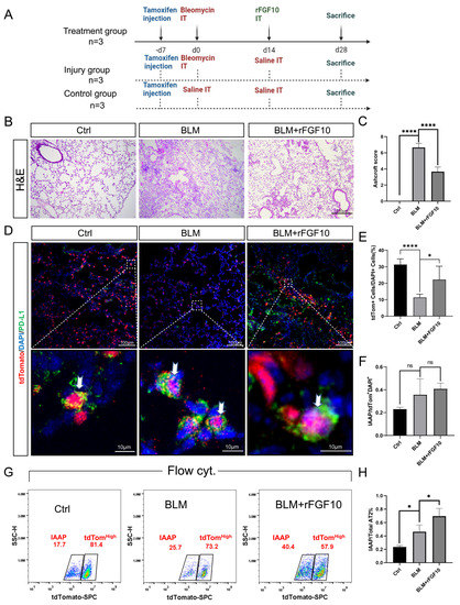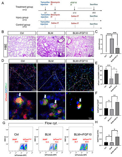 In an effort to bridge the gap between promising properties of endogenous Fgf10 manipulation and therapeutic reality, we here investigated whether the administration of exogenous recombinant FGF10 protein (rFGF10) can provide preventive and/or therapeutic benefit in a mouse model of bleomycin-induced pulmonary fibrosis. In addition to the histopathological aspects, we mainly focused on establishing the dynamic profile of IAAPs following BLM injury. A combination of flow cytometry and genetic lineage tracing was used to reveal the relationship between IAAPs and mature AT2s during the fibrosis development and resolution processes and the impact of rFGF10.