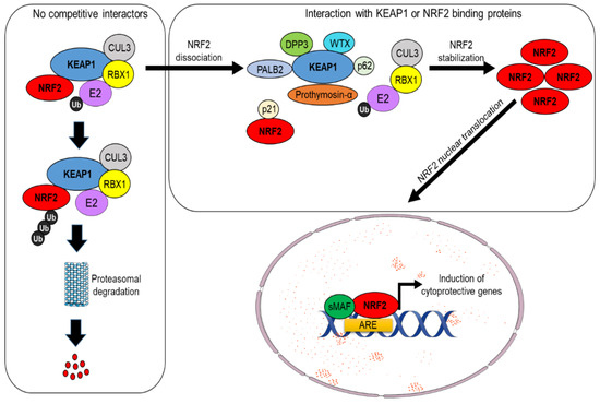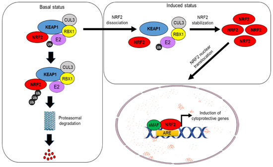 NRF2 is a very labile protein and is characterized by an extremely short half-life of approximately 20 min. Its activation is primarily controlled at the level of its protein stability, which is controlled by a number of different interactors that are regarded as canonical or non-canonical binding partners that ultimately influence/modulate the NRF2 degradation by the ubiquitin–proteasome system. A fine regulation exists to ensure constitutive activation of the cytoprotective pathways controlled by NRF2 under basal conditions while its steady-state levels are dramatically increased in response to specific stimuli (e.g., oxidative/electrophilic stress or chemical inducers) which, in turn, also enhance the expression of the NRF2 target genes.