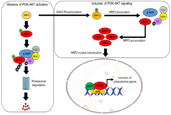 An alternative pathway for NRF2 degradation, which is instead KEAP1-independent, has been also identified in mouse cells and human cancer cells, and it is intimately connected with PI3K/AKT signaling. Indeed, in the absence of AKT activation, NRF2 is phosphorylated by the glycogen synthase kinase 3 beta (GSK-3β), and this event facilitates its recognition by the β-TrCP–Skp1–CUL1–RBX1 E3 ubiquitin ligase complex, which, in turn, promotes NRF2 ubiquitylation and its subsequent proteasomal degradation. By contrast, when upstream signals engage with the PI3K/AKT pathway, the GSK-3β protein is phosphorylated and, thus, inactivated; this relieves NRF2 from proteasomal degradation and leads to its stabilization [16,17,18] (see Figure 3). It has been proposed that these two axes cooperate to regulate the abundance of NRF2 in a distinct way since GSK3/β-TrCP would finely shape NRF2 levels in response to transient changes in cellular metabolism, while the impairment of KEAP1 is believed to induce a much larger increase in the NRF2 pool as a consequence of the exposure to different environmental stressors [19]. While the description of the detailed mechanisms of NRF2 regulation are beyond the scope of this manuscript, the interested reader is referred to other excellent review articles [5,20].